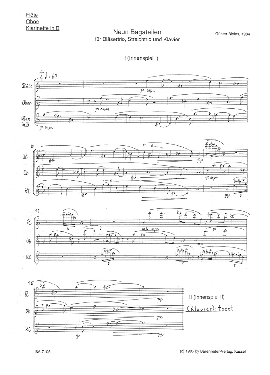 neun Bagatellen fur Blasertrio, String Trio und Klavier (1984)