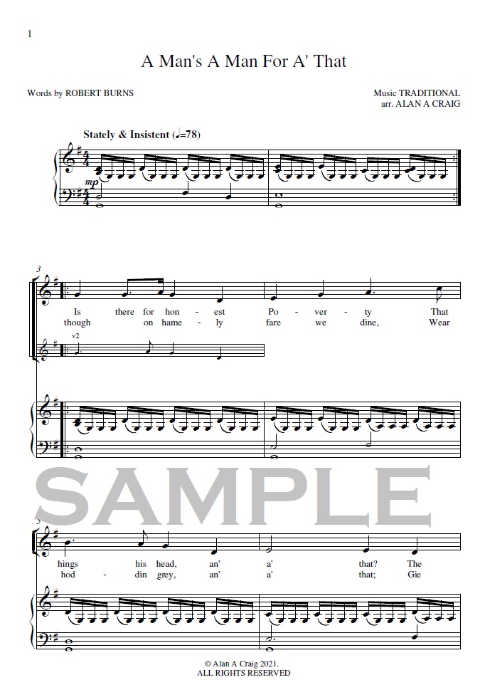 Blurb Robert Burns’ iconic song has become a rallying cry for justice and equality through the centuries. In this arrangement the world-famous Scottish folk melody is set for medium voice with a stirring concert piano accompaniment that complements the various moods of the text and builds to a rousing climax in the final chorus. Ideal for performance by classical musicians or students for concerts, recitals or Scottish-themed events.